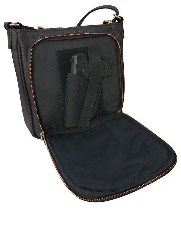 Perfect square bag are for all your essentials. Spacious main compartment has multiple pockets inside. Front side has 3 zipper pockets with leather zipper pulls. Back side is the concealment pocket with Long zipper pocket with a lockable YKK zipper. Adjustable & removable Velcro holster. Adjustable shoulder strap with wire reinforcement.