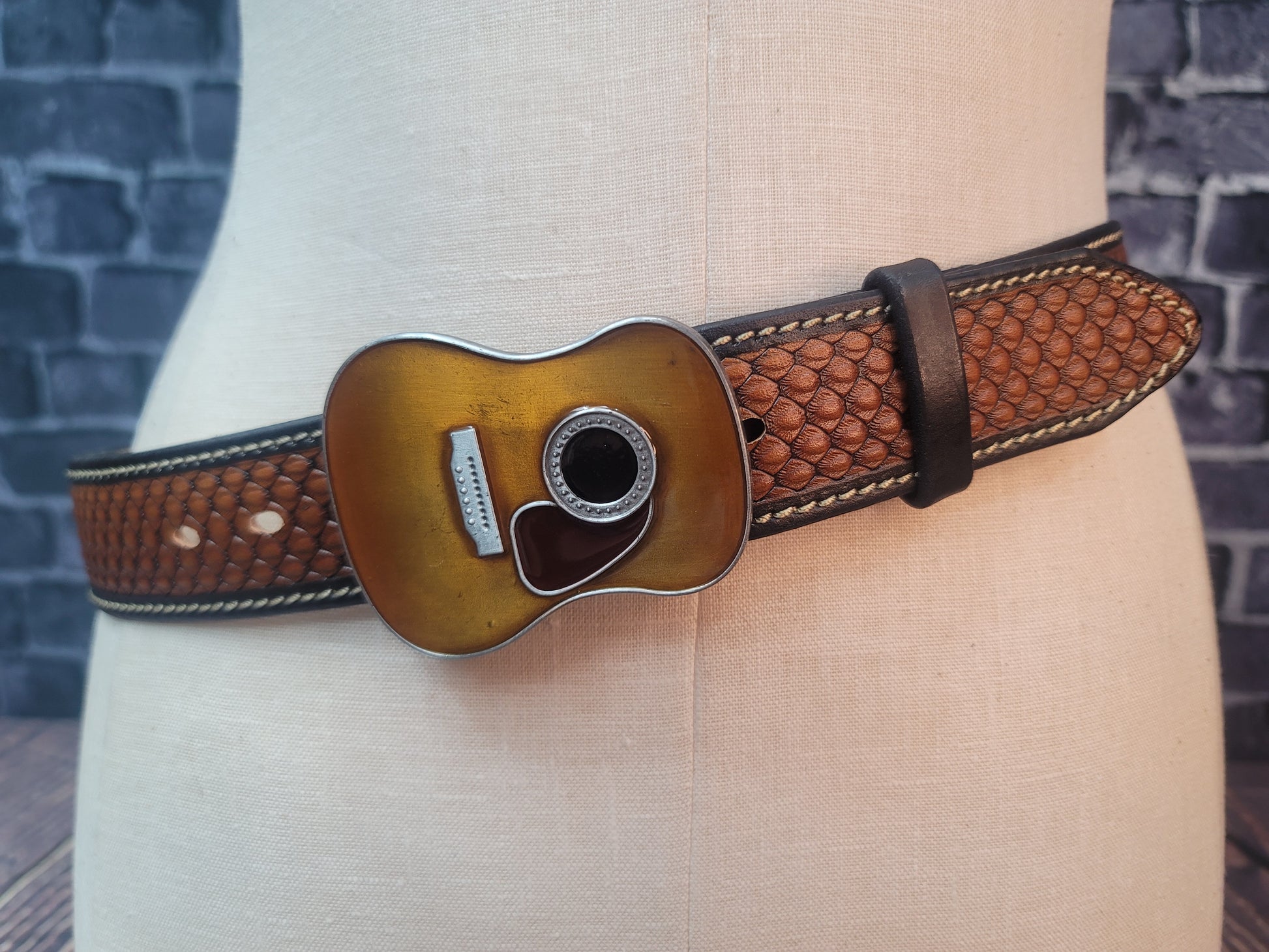 Upgrade your wardrobe with our Medium Brown Celetic Belt! Made from premium full-grain leather, this versatile and stylish belt features a beautiful embossed celetic design and a unique guitar belt buckle. With a perfect width of 1 1/2 inches and a range of Actual size from end of bukle to the holes (38 to 43 inches) it's the ideal fit for mens waist sizes 32-38 inches. Elevate any outfit for any occasion!